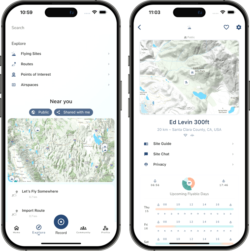 Mit einer weltweiten Datenbank von Flugplätzen und Routen können Sie schnell neue Orte zum Abfliegen entdecken. Jeder Flugplatz verfügt über detaillierte Wettervorhersagen, die Ihnen auf einen Blick fliegbare Standorte zeigen.
